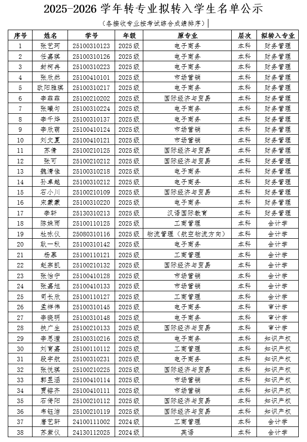 洹滨校区、明德书院按照安阳工学院《关于做好2025-2026学年转专业工作的通知》的要求,经学生申请、学院资格审核及转专业考核等环节,拟同意202517人转入财务管理专业、8人转入会计学专业、3人转入审计学专业、8人转入知识产权专业;20242人转入会计学专业,现将拟转入学生名单公示如下。公示期:202639日至311日,公示期内有异议的,可通过电话等形式进行反映。
